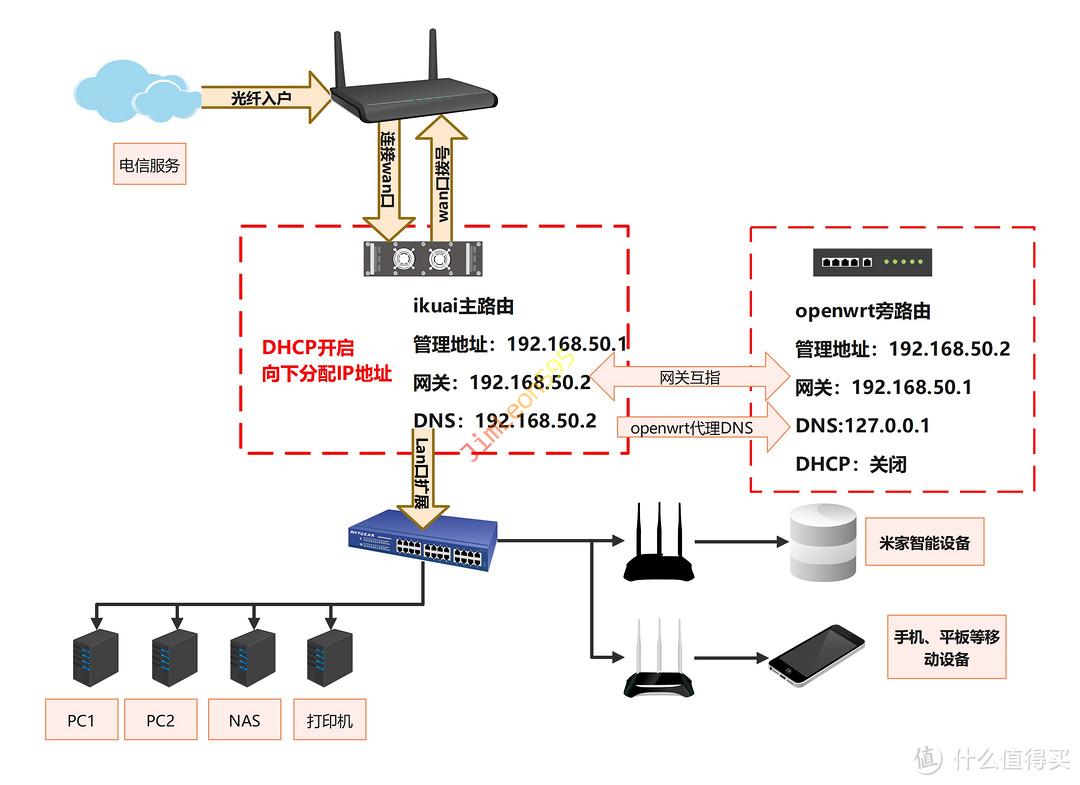 iKuai主路由开DHCP(未指向OpenWrt旁路由网关),OpenWrt旁路由关DHCP,旁路由只有LAN口工作,其他设备需设置静态网关为旁路由,需要设置。 -