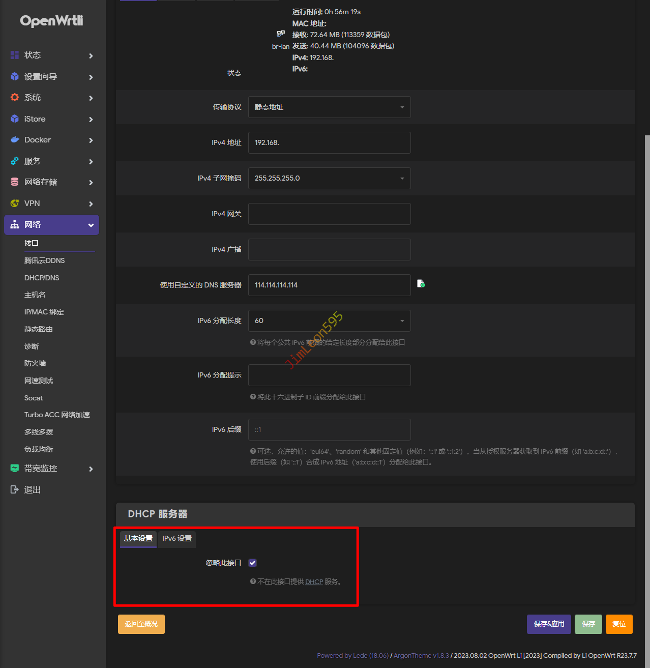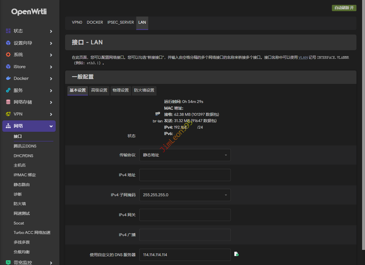 IPv4地址:为OpenWrt的IP地址,也是我们管理OpenWrt的地址。- 子网掩码:和