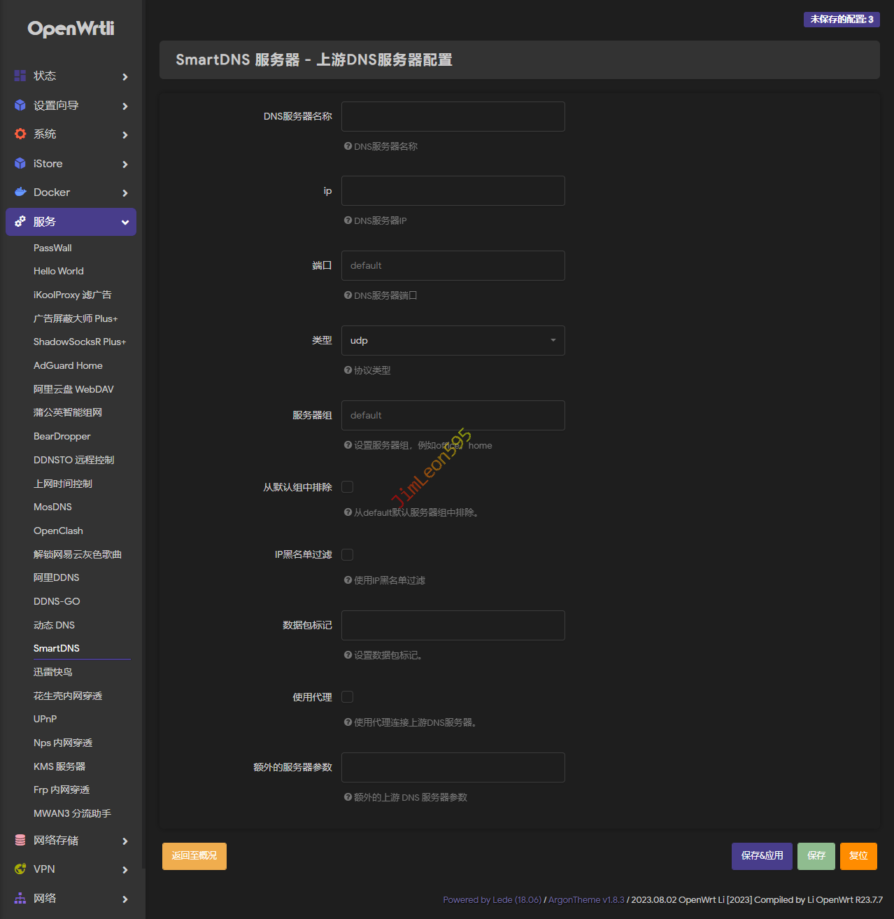 DNS服务器:首先设置一个自定义的DNS,这里我们先设置一个能用的DNS即可,保证我们在设置过程中可以上网,后面设置好了,可以将DNS改为由OpenWrt代理。