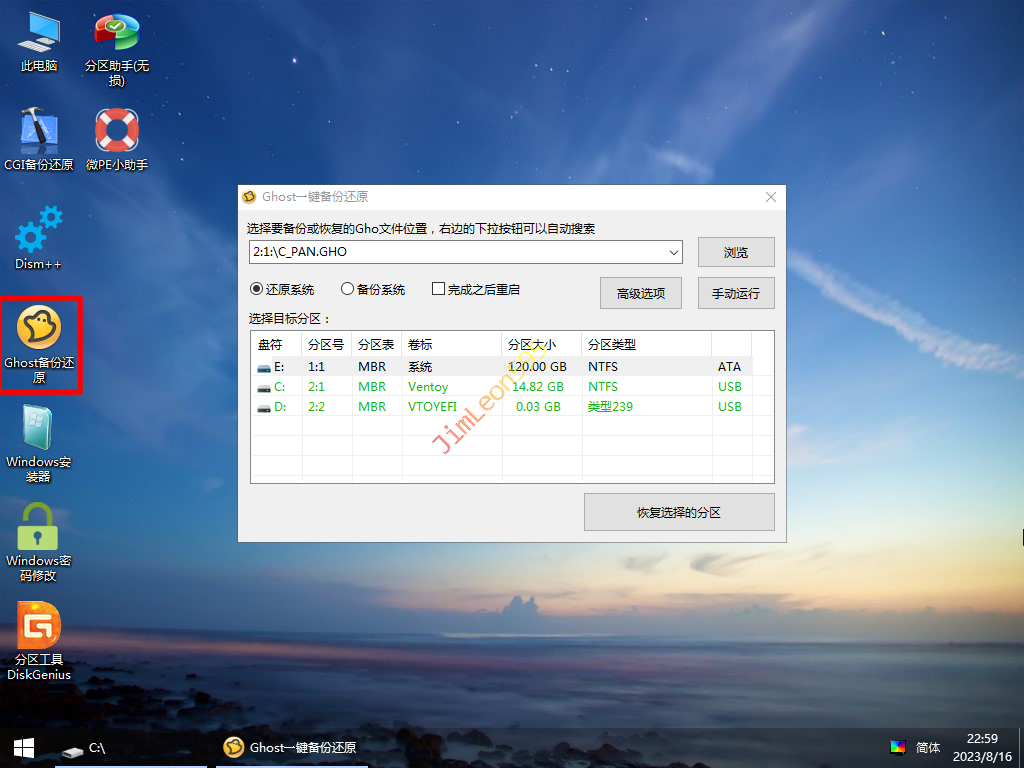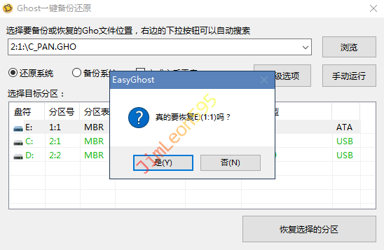 Ghost 备份还原--> 选择需要恢复的Ghost镜像 --> 选择目标分区