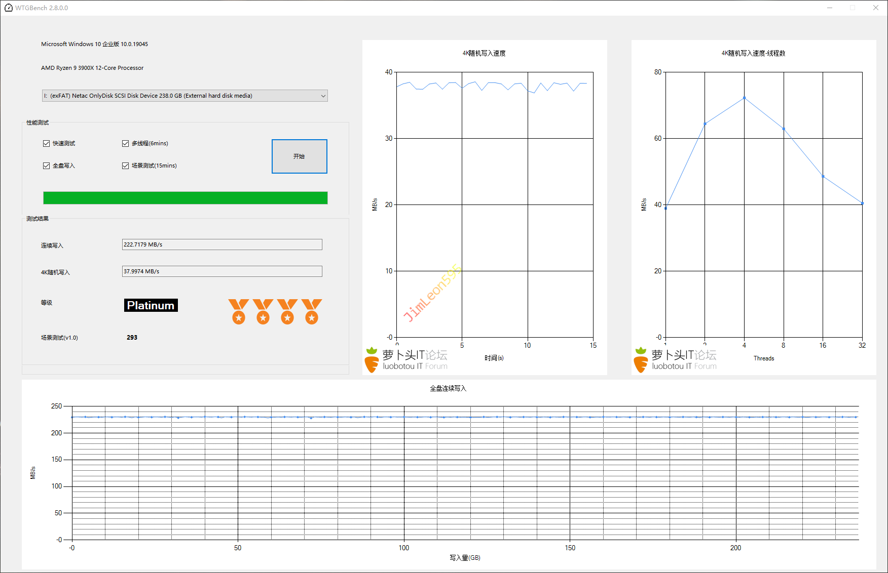 ChipGenius 芯片精灵 CrystalDiskInfo 因为不是SSD【固态硬盘】和HDD【机械硬盘】 所以测试设备作为U盘,该项略过 TxBENCH CrystalDiskMark IsMyHdOK ATTO Disk Benchmark TrimCheak WTGBench AS SSD Benchmark 鉴于它的4K真的太差了 我们就放过他吧【两个小时都没跑完】 而且都是0.00MB/s没什么意思 这个4K不能说没有,只能说聊胜于无