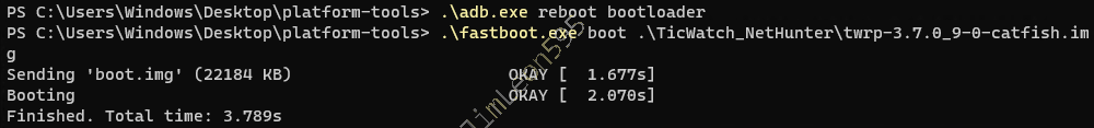 | fastboot boot twrp-3.7.0-9-0-catfish.img