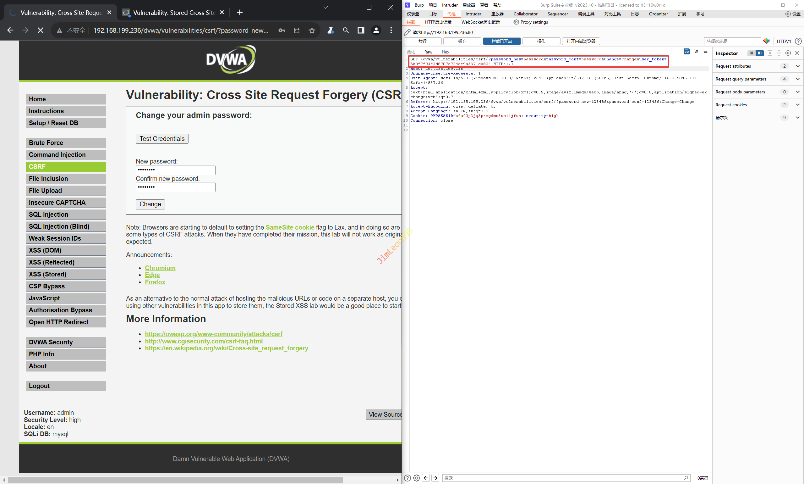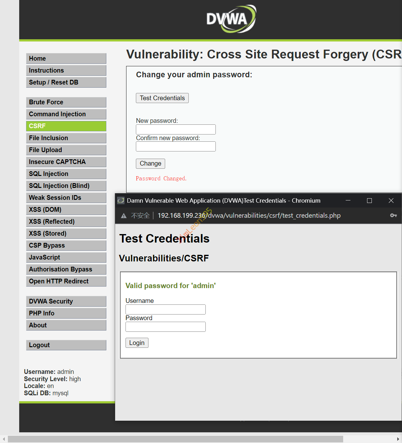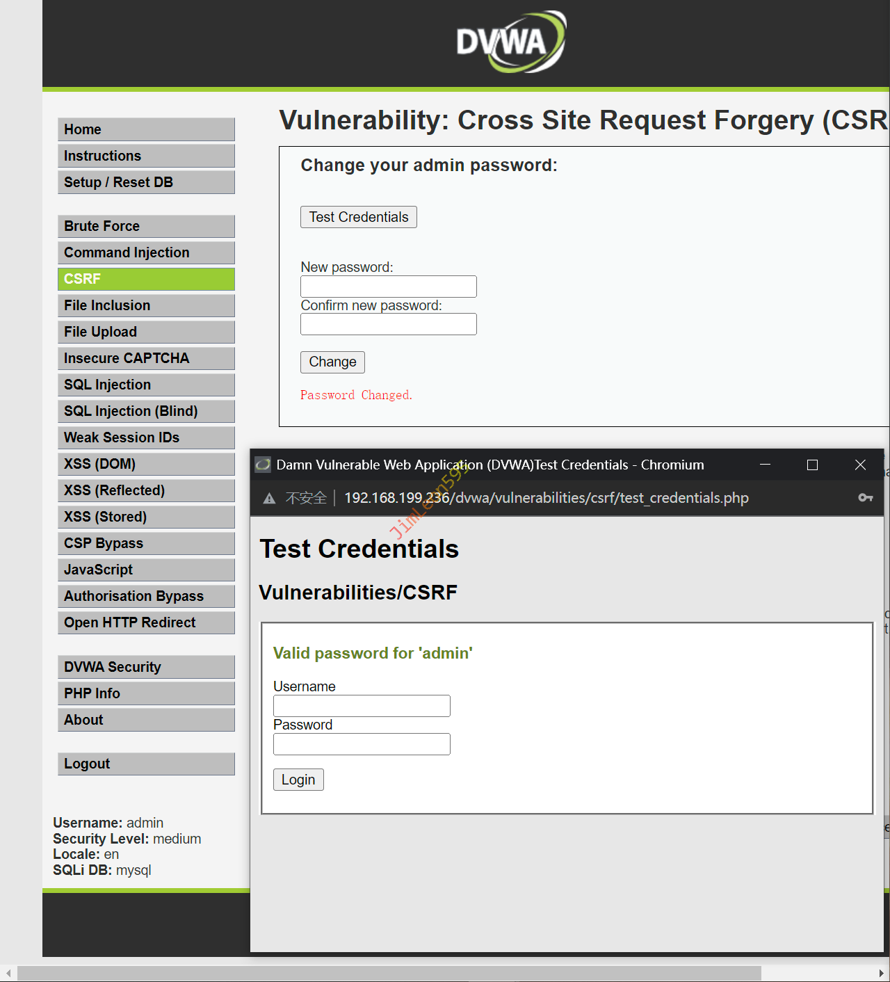 1 http://192.168.199.236/dvwa/vulnerabilities/csrf/?password_new=123456&password_conf=123456&Change=Change#