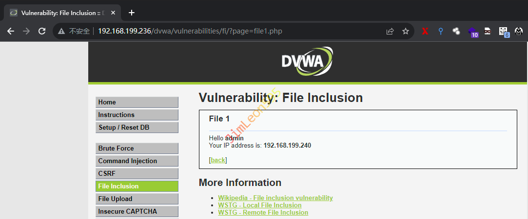1 | http://192.168.199.236/dvwa/vulnerabilities/fi/?page=file1.php |