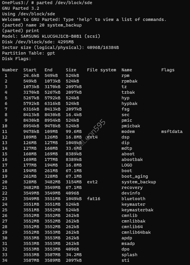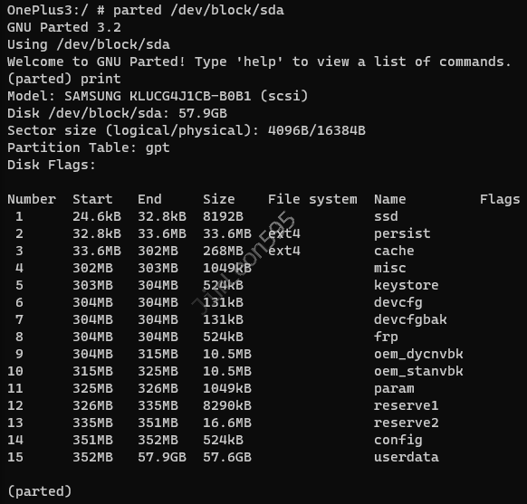 | # 进入硬盘sde分区 parted /dev/block/sde # 查看详细分区使用情况 print