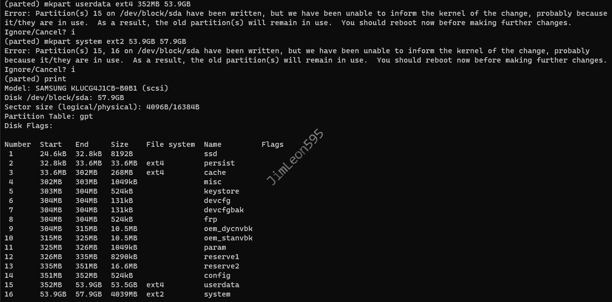 | # 进入 sda 分区 parted /dev/block/sda # 创建 userdata 分区 mkpart userdata ext4 352MB 53.9GB # 创建 system 分区 mkpart system ext2 53.9GB 57.9GB