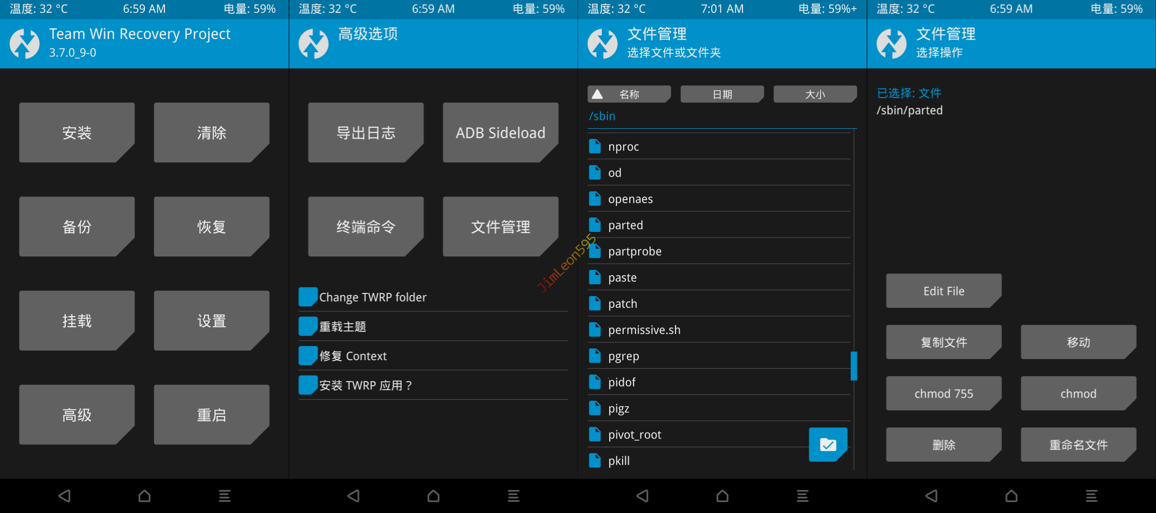 高级 --> 文件管理 --> /sbin/parted --> chmod 755