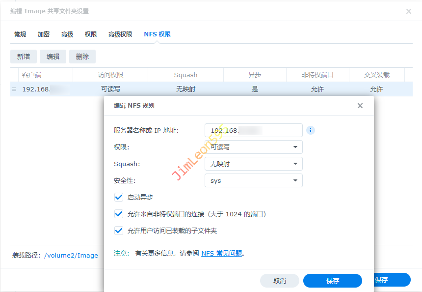 NFS挂载详细信息名称填写 显示名称NFS 服务器填写Synology IP 地址NFS 共享填写Synology NFS 文件夹地址用户名和密码按照自己需求设置