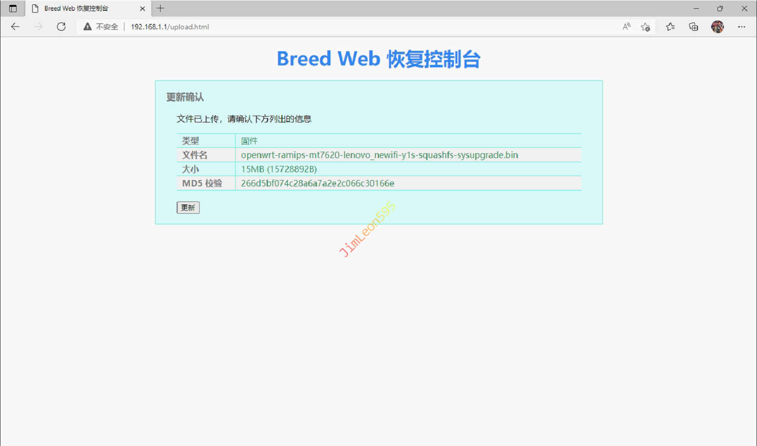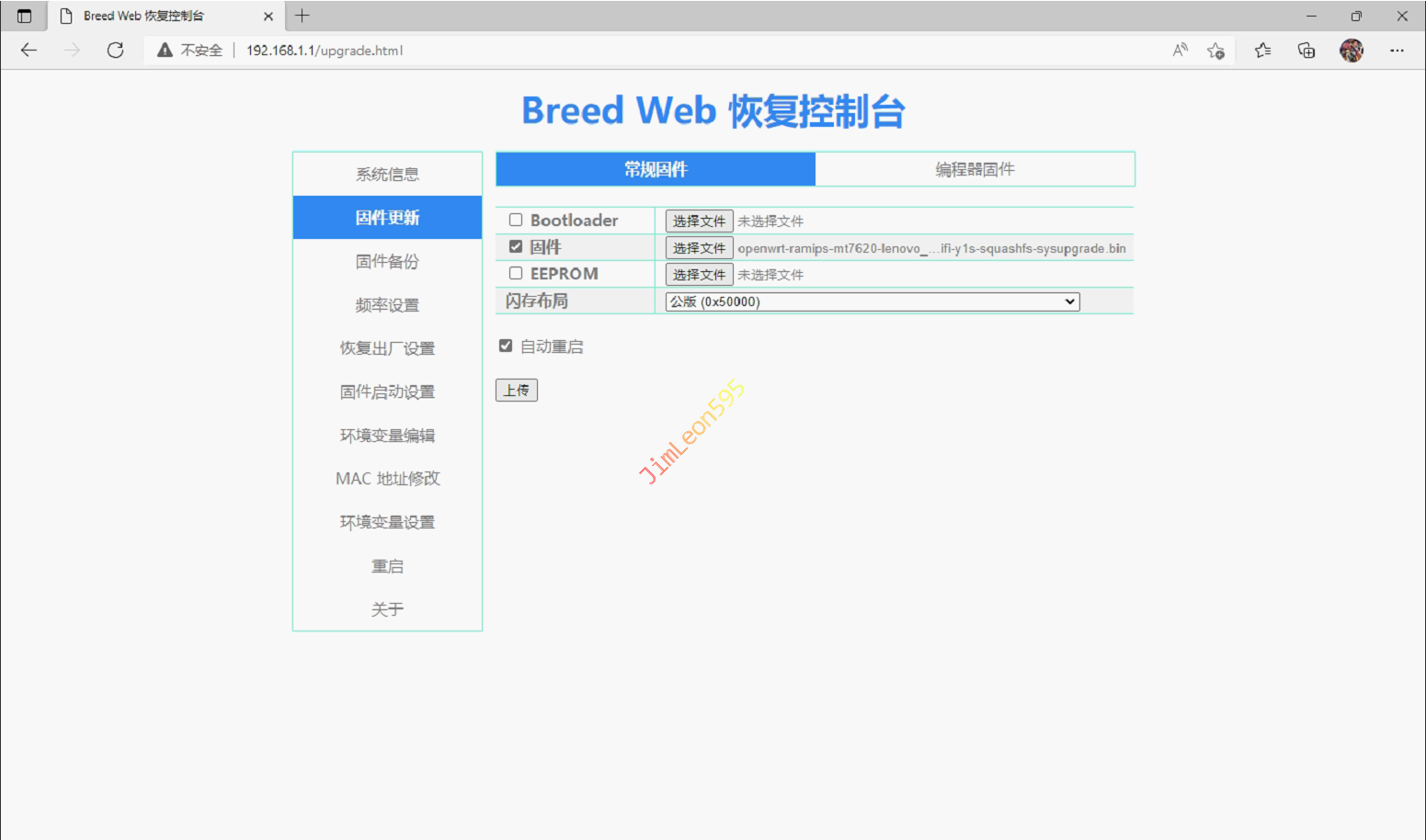 固件更新并勾选固件并选择下载好的OpenWrt点击上传
