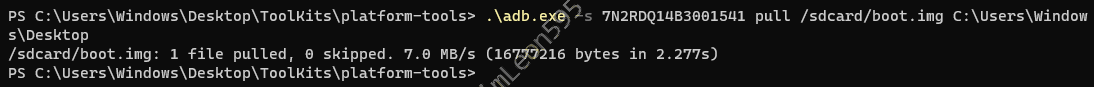 | adb pull /sdcard/boot.img C:\Users\<Device_Name>\Desktop