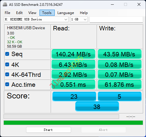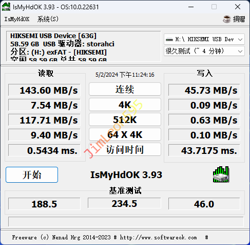 设备外观 USB-A口 USB-C口 ChipGenius 芯片精灵 CrystalDiskInfo 因为不是SSD【固态硬盘】和HDD【机械硬盘】 所以测试设备作为U盘,该项略过 TxBENCH CrystalDiskMark IsMyHdOK ATTO Disk Benchmark TrimCheak 查看 Windows 是否开启 TRIM 功能 1fsutil behavior query disabledeletenotify 如果本机开启了TRIM功能 会显示 =0 (已禁用) exFAT NTFS WTGBench AS SSD Benchmark 写保护功能 小拨片在🔒处即为开启写功能保护