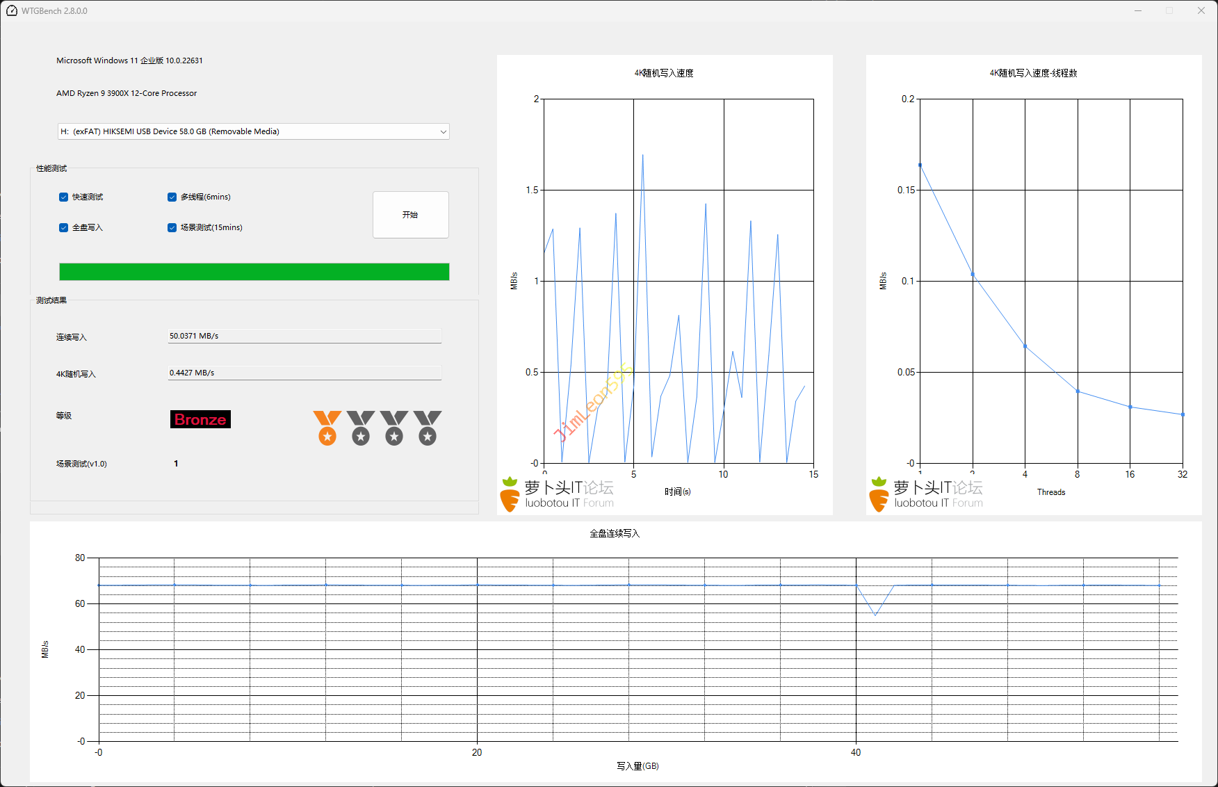 ChipGenius 芯片精灵 CrystalDiskInfo 因为不是SSD【固态硬盘】和HDD【机械硬盘】 所以测试设备作为U盘,该项略过 TxBENCH CrystalDiskMark IsMyHdOK ATTO Disk Benchmark TrimCheak WTGBench AS SSD Benchmark 鉴于它的4K真的太差了 我们就放过他吧【两个小时都没跑完】 而且都是0.00MB/s没什么意思 这个4K不能说没有,只能说聊胜于无
