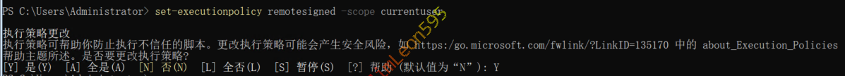 输入以下指令,保证允许本地脚本的执行,选择[Y] 是(Y)