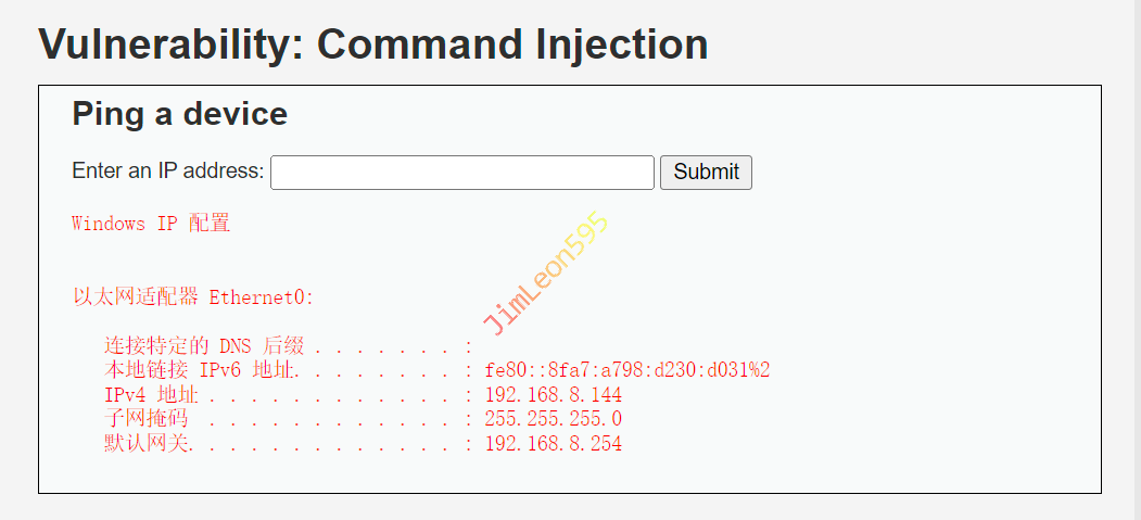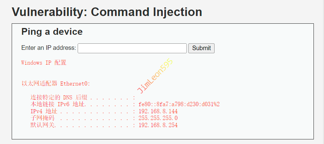 1 2 3 4 5 6 7 8 9 10 11 12 13 14 15 16 17 18 19 <?php if ( isset ( $_POST [ 'Submit' ] ) ) { $target = $_REQUEST [ 'ip' ]; if ( stristr ( php_uname ( 's' ), 'Windows NT' ) ) { $cmd = shell_exec ( 'ping ' . $target ); } else { $cmd = shell_exec ( 'ping -c 4 ' . $target ); } echo "<pre>{$cmd} </pre>" ; }