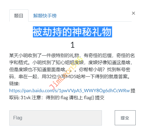 所以这题的答案是flag{1d240aafe21a86afc11f38a45b541a49}