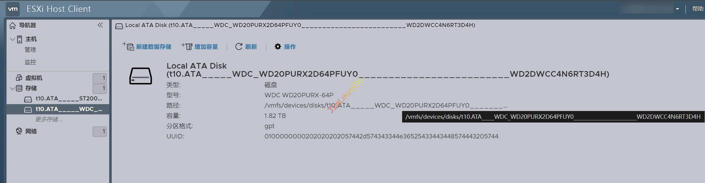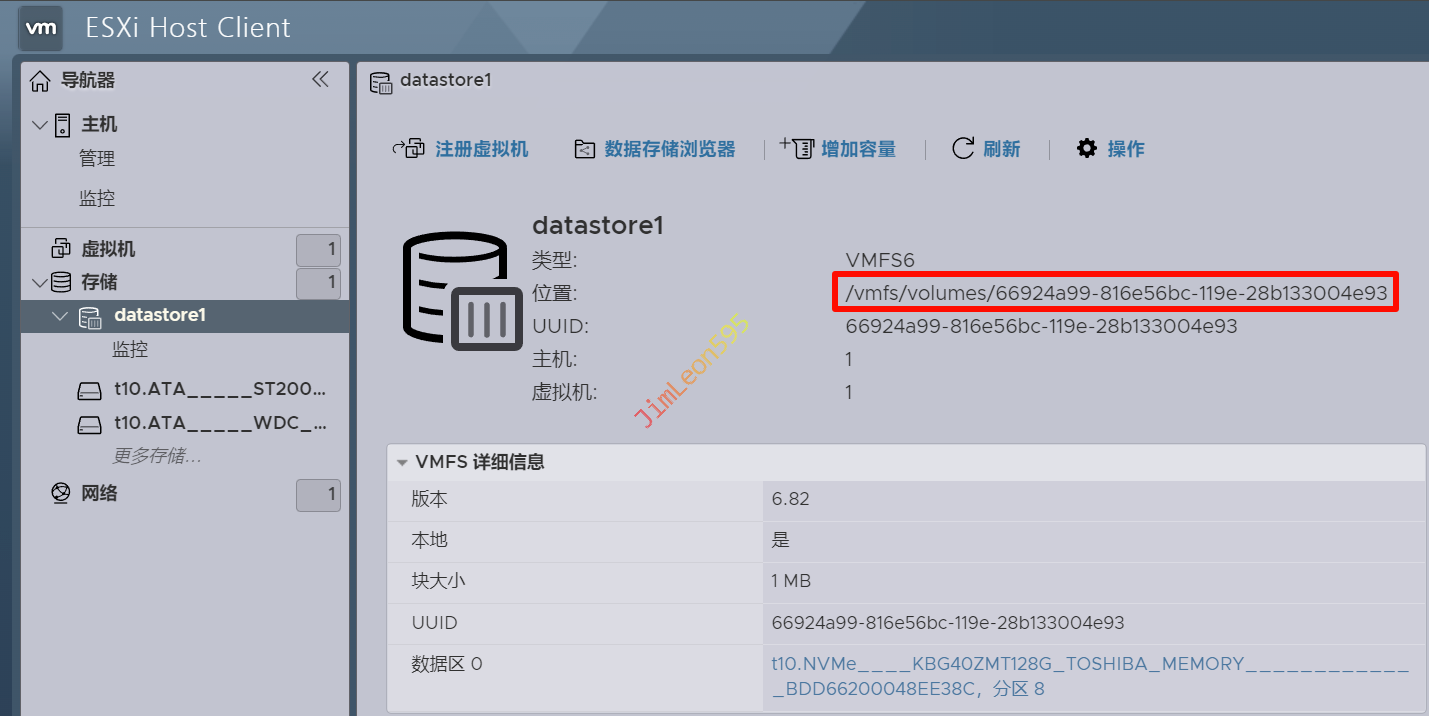 1. 选择 存储 --> 数据存储,查看存储映射文件的 VMFS 位置,设为 路径2