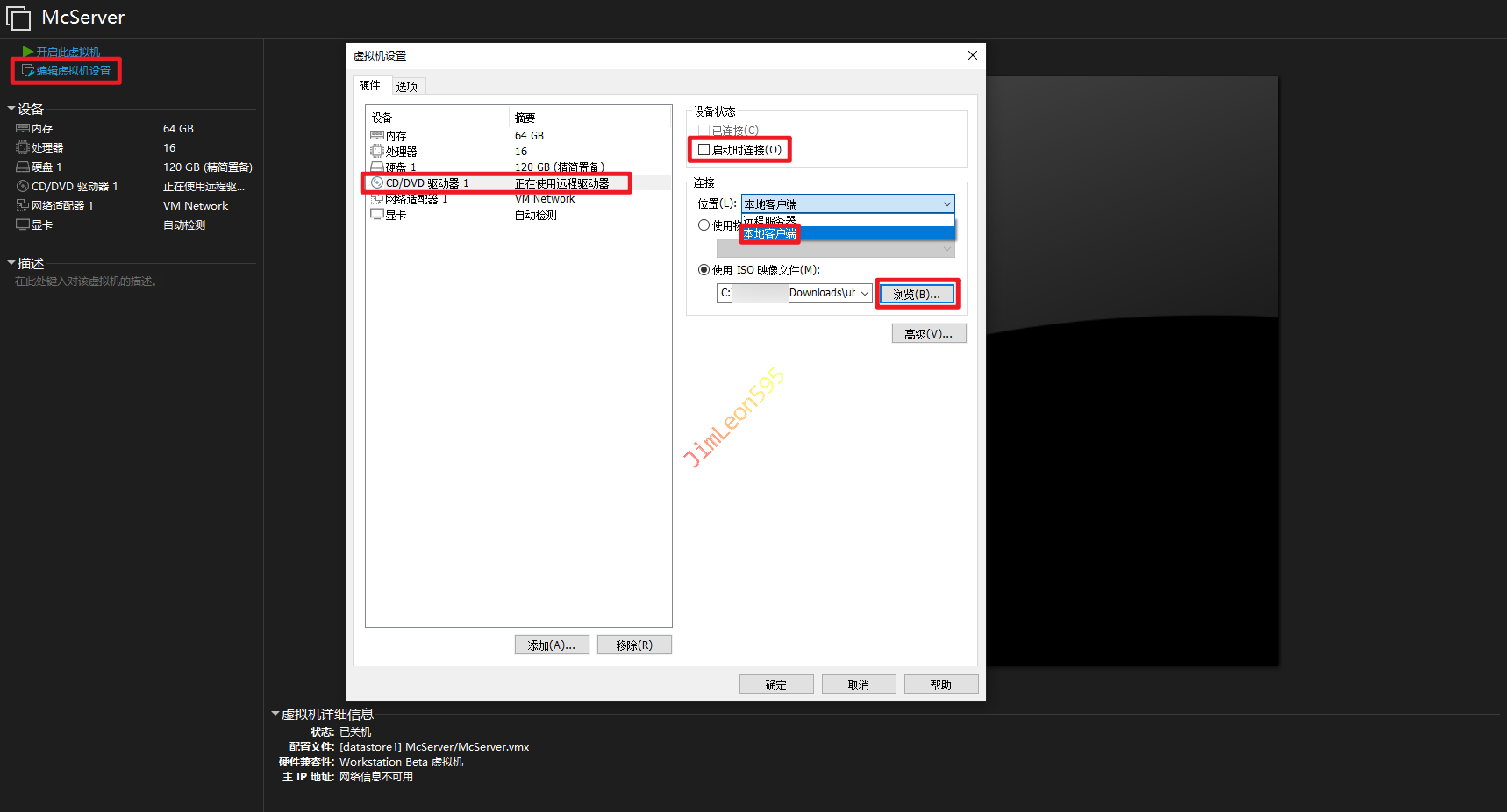 编辑虚拟机设置 --> CD/DVD驱动器 --> 位置:本地客户端 --> 使用ISO映像文件 --> 选择我们想要安装的系统镜像 --> 勾选启动时连接 --> 确定