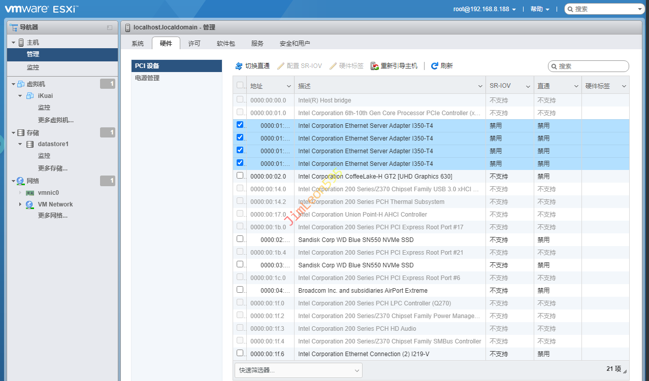 管理 --> PCI 设备 --> 选择需要直通的设备 --> 切换直通