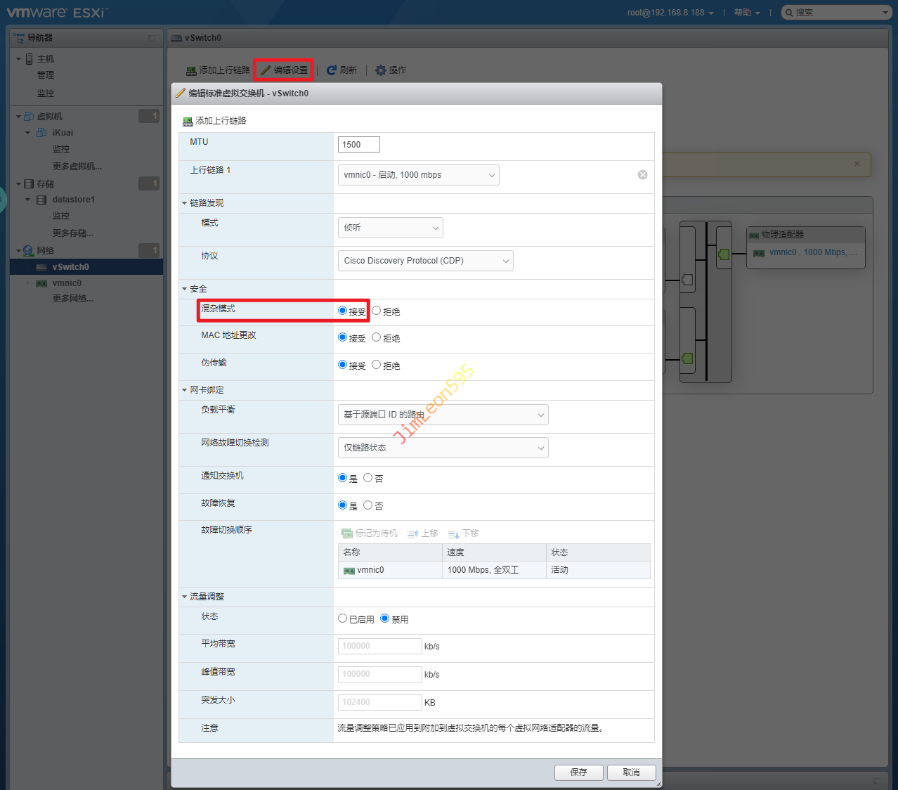 vSwitch0 --> 编辑设置 --> 安全 --> 混杂模式